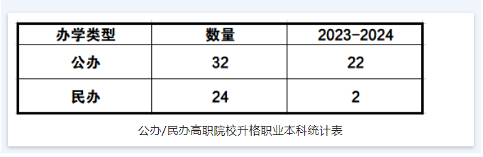 从办学性质来看,56所职本中有32所公办院校、24所民办院校。但2023-2024年升格职本的24所院校中,公办院校有22所,占比92%。