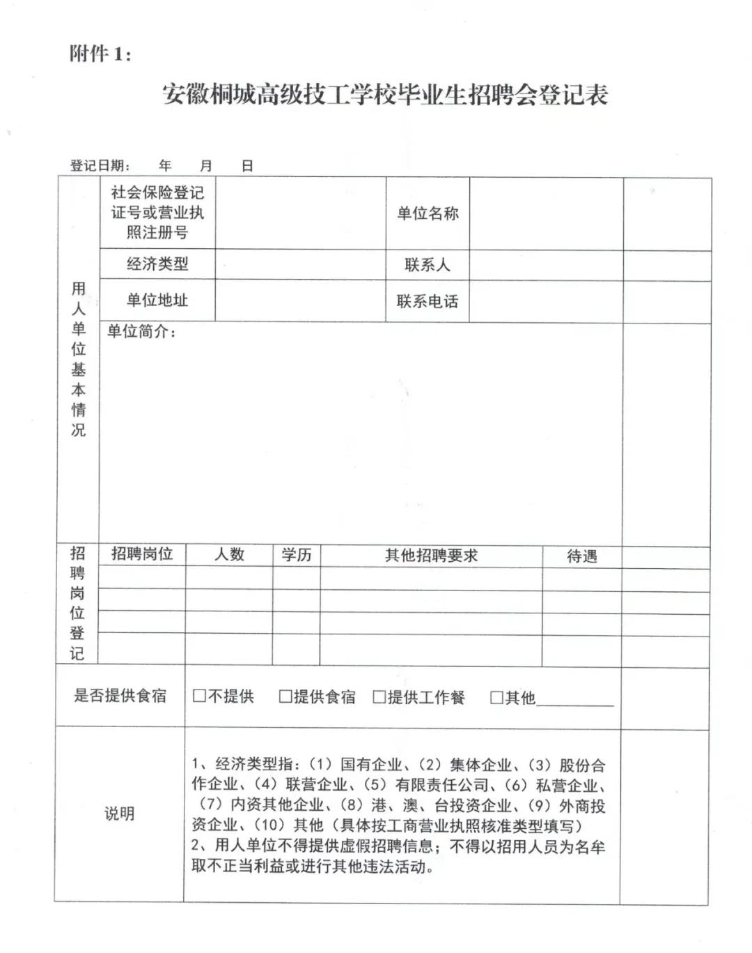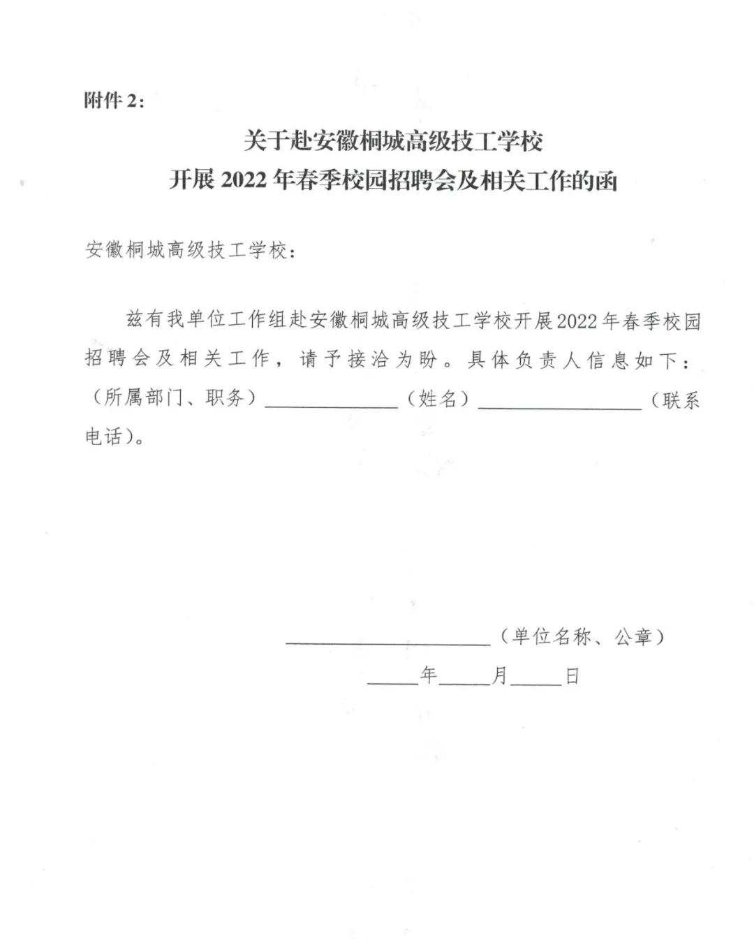 尊敬的用人单位: 您好!感谢贵单位长期以来对我校毕业生就业工作的关心与大力支持!为搭建用人单位与我校毕业生供需见面的平台,促进用人单位选才用人和我校毕业生就业工作,现就2022年我校春季校园招聘会相关事宜告知如下: 一、招聘会时间 2022年3月4日(农历二月初二)。 二、涉及毕业生专业 电子商务、数控加工、工业智能机器人、高铁航空乘务、新能源汽车等。 三、招聘报名及流程 1、各招聘单位请与我校创就业中心徐主任联系报名(电话:0556-6567810;17505600101),同时填写《毕业生招聘会登记表》,详见附件1;企业报名截止时间:2022年2月27日。 2、参与招聘单位须提供一份面向学生宣传的招聘简章,简章内容应包括企业介绍、招聘岗位及要求、招聘人数、相关待遇等,以便让学生详细了解。 3、《毕业生招聘会登记表》和招聘简章请发至邮箱:1827343075@qq.com。我校将对用人单位提供的资料进行审核,审核通过后将及时与各单位确认。特别提示:招聘简章所发布的内容必须真实可靠(申请入校招聘的单位请提供企业营业执照复印件)。 4、招聘单位可根据招聘会时间,提前对接学校,学校将根据各单位具体情况及本次入校招聘需求,分批次安排专场宣讲和面试。入校宣讲时,请各单位携带纸质版招聘公函,公函样本详见附件2。 四、注意事项和要求 1、根据上级疫情防控政策要求,请企业参会代表,提前准备好出发前48小时内及到达桐城市后的核酸检测阴性两张证明,健康码、通行大数据行程卡进入校园。考虑到实际情况,本次招聘会暂不安排中高风险区企业参会,敬请谅解。 2、用人单位来校开展校园招聘应遵循公开、公平、公正和自愿的原则,遵循男、女毕业生平等对待的原则,在招聘活动中应如实宣传。 3、用人单位不得以招聘保密为由,进行私下面试活动,招聘活动中如有违反本须知相关规定的,学校有权停止其招聘活动。 再次感谢各用人单位对我校毕业生就业工作的大力支持与关心!