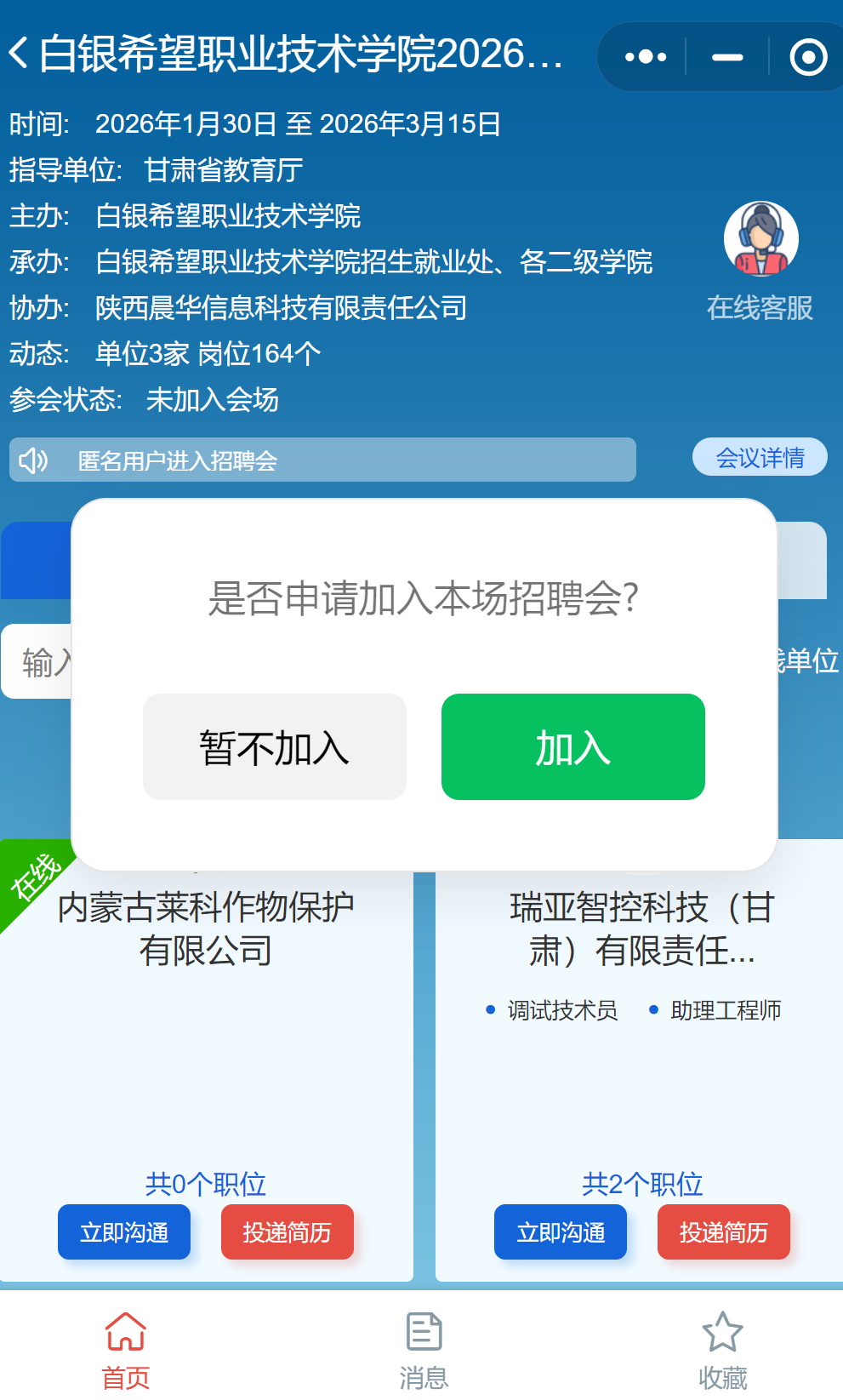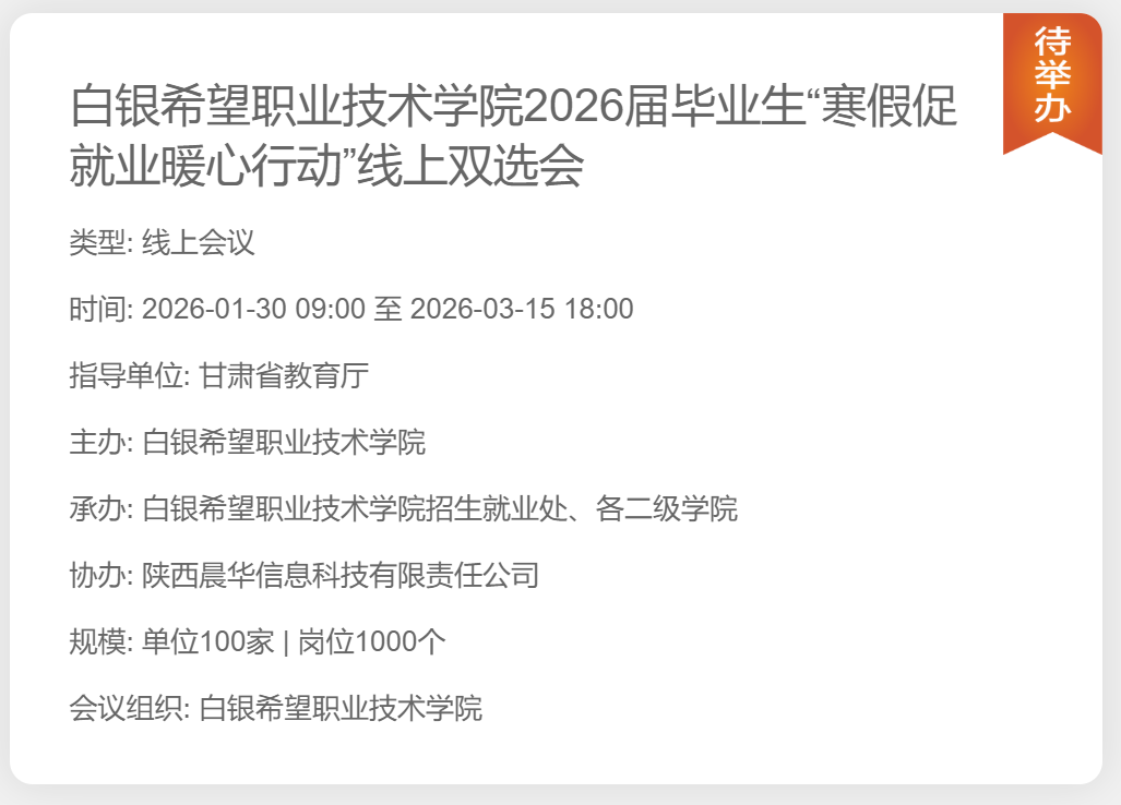 为深入贯彻落实2026届全国高校毕业生就业创业工作会议及省教育厅“寒假促就业暖心行动”工作部署要求,充分利用寒假窗口期,为毕业生与用人单位搭建良好的求职招聘平台,学校将举办白银希望职业技术学院2026届高校毕业生“寒假促就业暖心行动”线上双选会,现诚邀各用人单位参会选才、交流合作,共促就业。具体事宜函告如下: 一、组织单位 指导单位:甘肃省教育厅 主办单位:白银希望职业技术学院 承办单位:陕西晨华信息科技有限责任公司 二、活动内容 活动形式:网络招聘 活动时间:2026年1月30日9:00至3月15日18:00 参会群体:有用工需求的各类招聘单位;2025届、2026届毕业生;其他有就业求职需求的各类人才。 平台支持:云端会 三、参会方式
