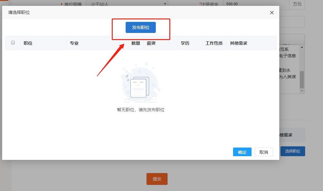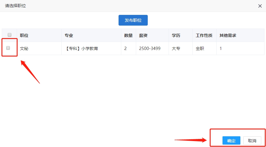 如还未添加职位,请点选“发布职位”,发布职位后再点选职位、点击“确定”;