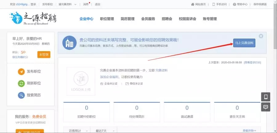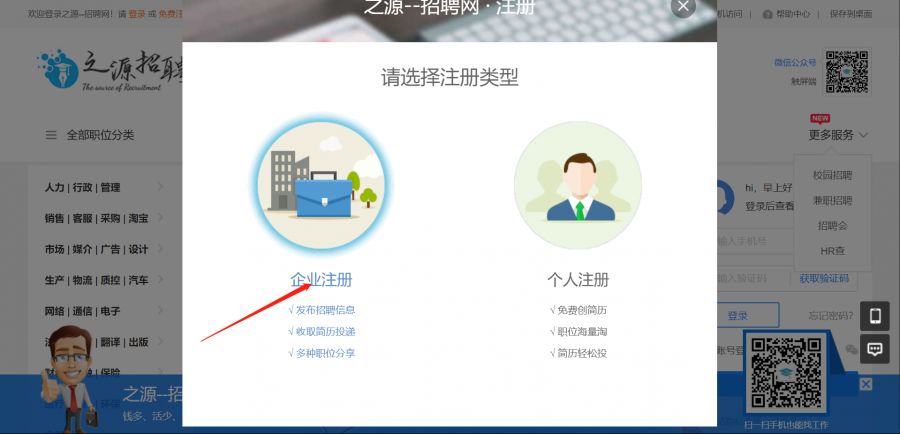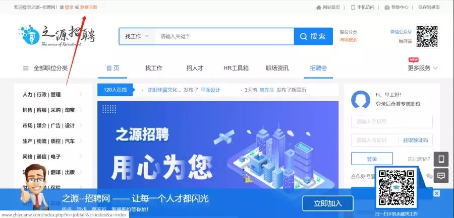 登录之源招聘网站(www.zhiyuanw.com)点击免费注册