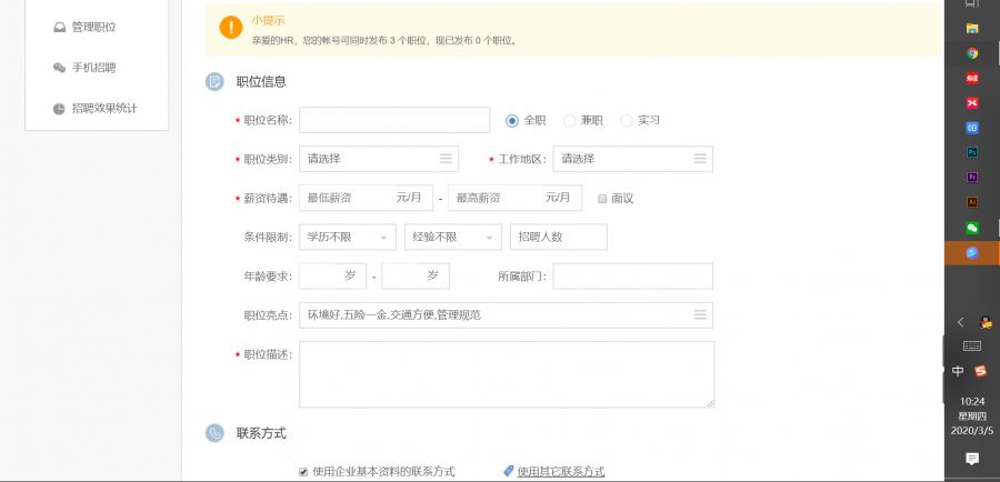 显示资料保存成功后点击发布职位就可以发布职位进行招聘