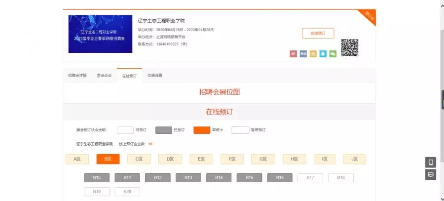 进入招聘会页面显示辽宁生态工程职业学院,点击在线预订即可